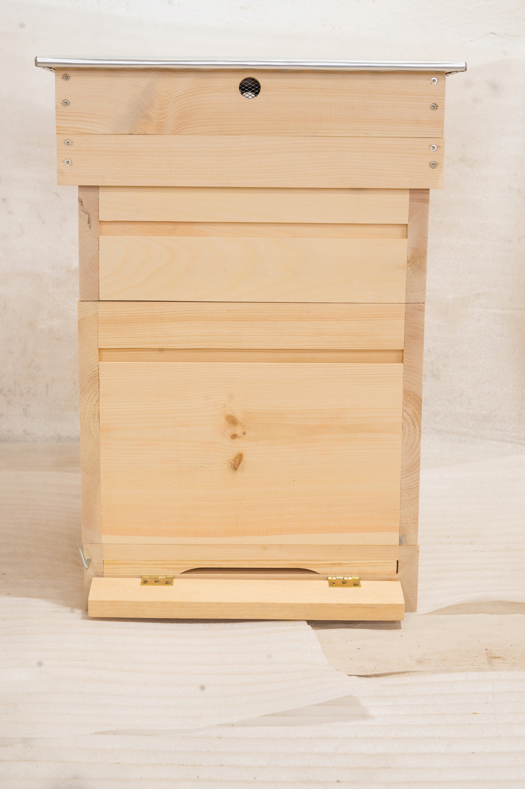 • Dennica wysoka higieniczna z wkładką do kontroli osypu warrozy. Dennica wyposażona jest w zamontowane lądowisko na zawiasach oraz w zakrętkę wiedeńską, co umożliwia szybkie zamknięcie dennicy i transport pszczół.