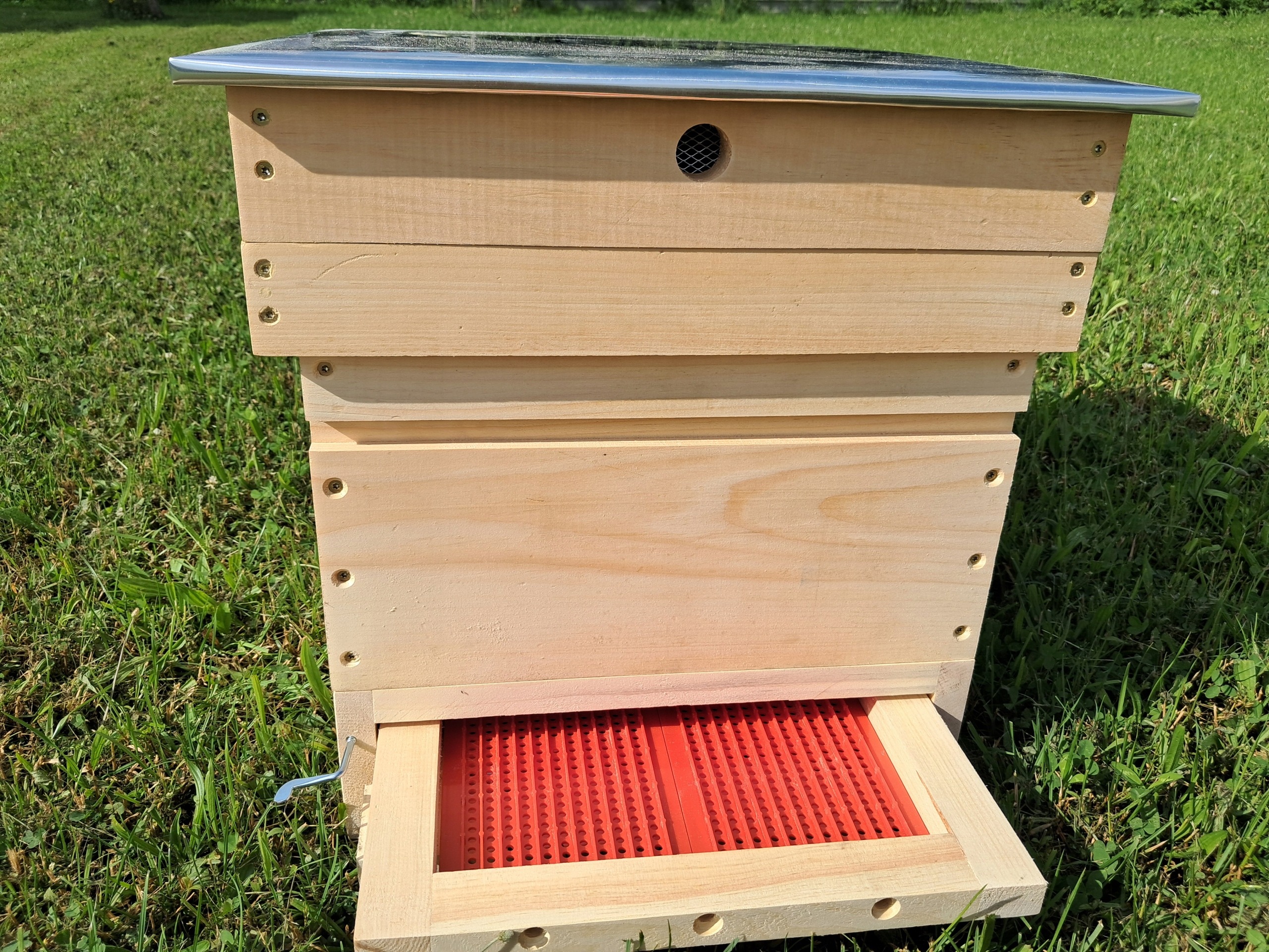 -dennica higieniczna wysoka z funkcją poławiania pyłku. Dennice są wyposażone w specjalną szufladę w której zamontowane są płytki poławiające pyłek. Szufladę po poławianiu pyłku wyciągamy szybko przez wylotek i wkładamy w to miejsce wkładkę wylotową zmniejszającą wylotek. Od tyłu w dennicy jest szuflada na pyłek z drobną odporną na uszkodzenia siatką która automatycznie oczyszcza pyłek z drobin i zgryźlin a zarazem dzięki zastosowaniu siatki pyłek nie pleśnieje i utrzymuje swoją najwyższą jakość nawet wyciągając pyłek co kilka dni. Jeżeli nie poławiamy pyłku to na siatkę nakładamy specjalną formatkę z sklejki która ogranicza wychładzanie gniazda i nadmierny przewiew w gnieździe. Polecam niesamowicie to rozwiązanie. Dennice są też dostępne w sprzedaży indywidualnie. Dennica ma dodatkowo „lądowisko” które jest na zawiasach montowane i dodatkowo jest zamykane bardzo szybko więc przy przewożeniu uli lub jakiś pracach na pasiece pszczoły możemy zamknąć w około 5 sekund.